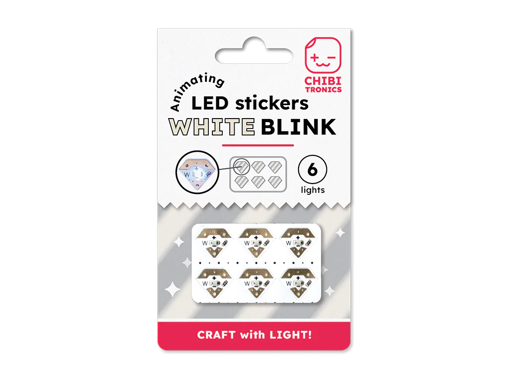 Chibitronics new animating White Blink LED sticker is shaped like a sparkling gem! Complete a circuit with a 3 volt coin cell battery (we recommend the CR2032 or the flatter CR2016) and copper/fabric conductive tape, and this LED will rhythmically blink on and off! You can find more information and easy to use templates for the White Blink LED stickers here.