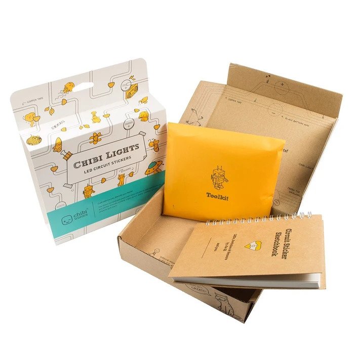 Our Chibitronics Starter Kit comes with the illustrated Circuit Sticker Sketchbook, 12 circuit stickers (6 white, 2 yellow, 2 red and 2 blue), 2 binder clips, 2 coin cell batteries and a roll of copper tape (16 feet/5M). The Sketchbook walks you though five circuit concepts including parallel circuits, switches and resistance-based sensors. Every activity comes with a circuit theory lesson, a template with drawing activity and then an open-ended activity for you to design and create your own circuits. Since the circuits are completed right on the pages of the book, you will have an interactive sketchbook of working circuits to refer to as you design your own projects. Best of all, you'll be able to learn new electronics concepts while also expressing yourself in whole new ways.