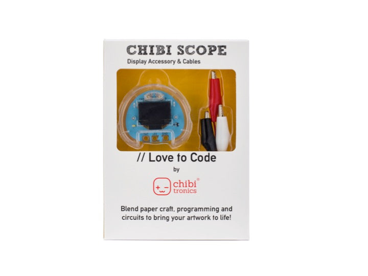 The Chibi Scope is the perfect companion to your Chibi Chip. It’s a tiny screen designed to help you understand what’s going on inside your Chibi Chip. It’s an essential tool for educators, and for intermediate and above coders. It packs three functions — text, volts and wave — into one compact package. The Chibi Scope connects to your Chibi Chip using the three included alligator clips; wire up +5V, GND, and TXT, and you’re ready to go.