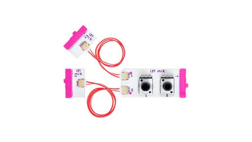 The littleBits mix Bit allows you to combine 2 inputs and send them to a single output. It also has a volume control for each of its inputs -- that's where the 'mixing' comes in. Use it to play 2 oscillators on a single speaker!
