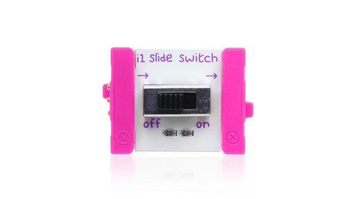 The slide switch is a small and convenient way to turn your creations on and off. It uses a sturdy plastic lever to switch back and forth. Try it with any of your favorite Bits, like the DC motor or bright LED!