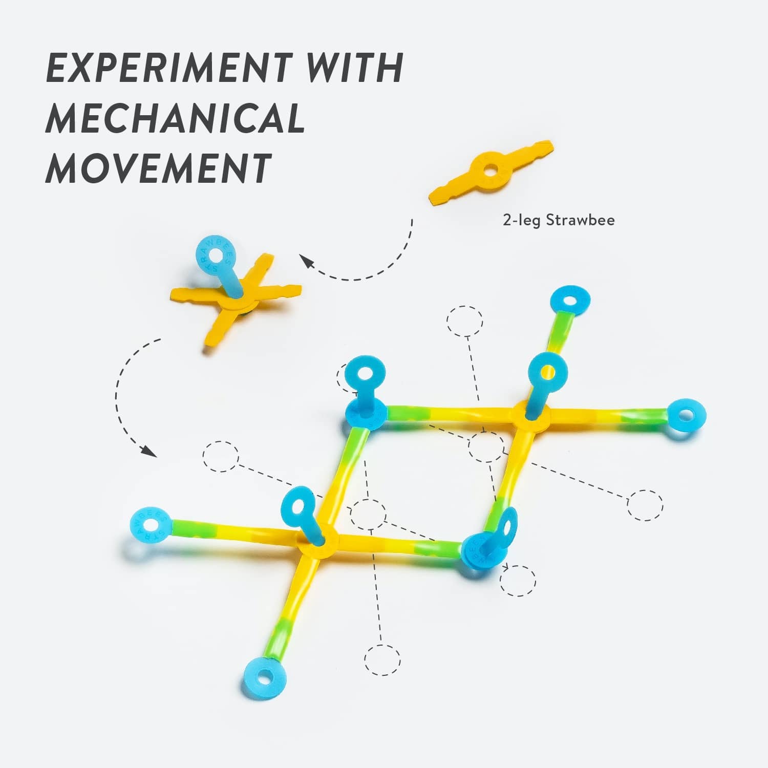 The Strawbees STEAM Starter Kit is a personal sized building set with 230 pieces to build several small towers, moving mechanical cranes and arms. The building set comes with 5 different precut straw sizes and 4 color-coded connectors organized in the box.